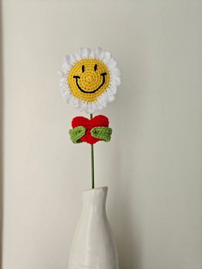 This Crochet Heart Stealer Flower is designed to melt hearts at first sight. Handcrafted with soft, vibrant yarn, this cheerful smiling bloom holding a heart brings warmth, joy, and a touch of whimsy to any space. Its playful expression and lovable design make it a perfect Valentine’s gift or a delightful decor piece to spread love all year round.