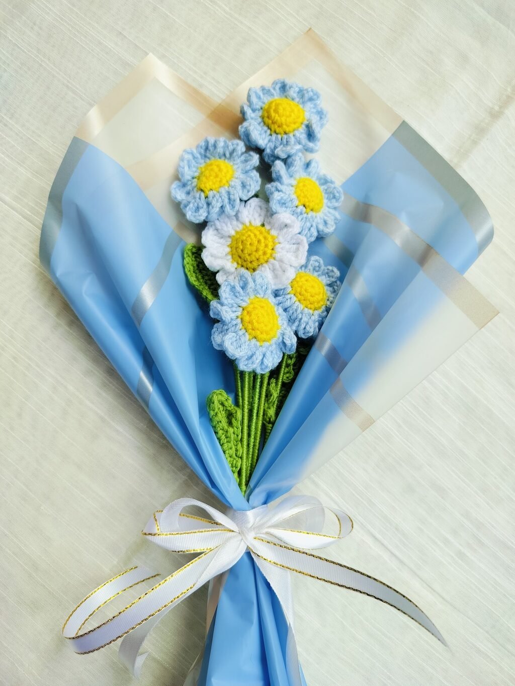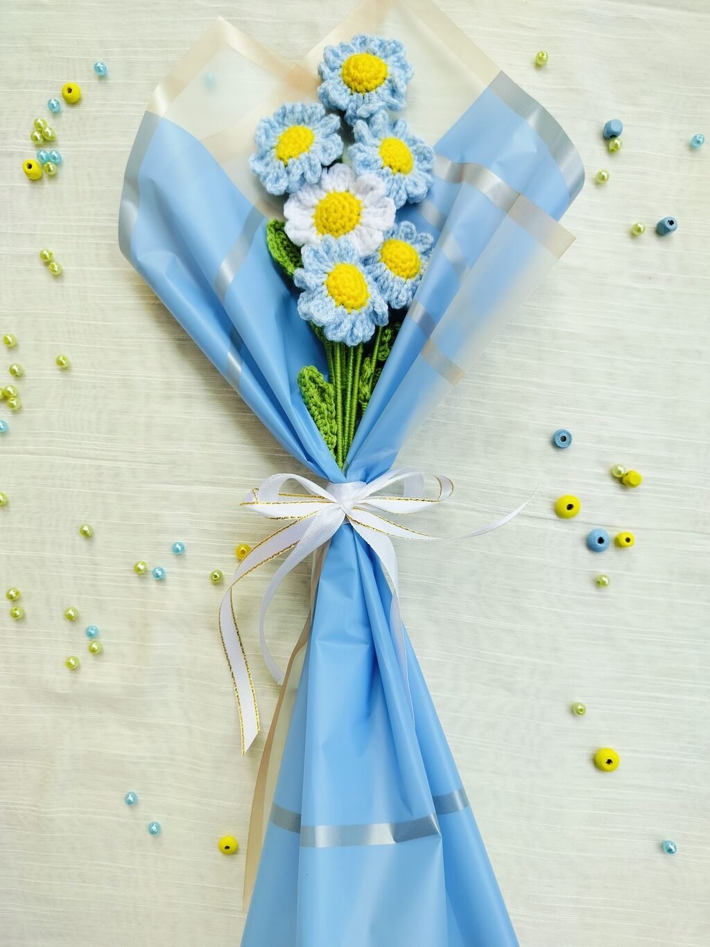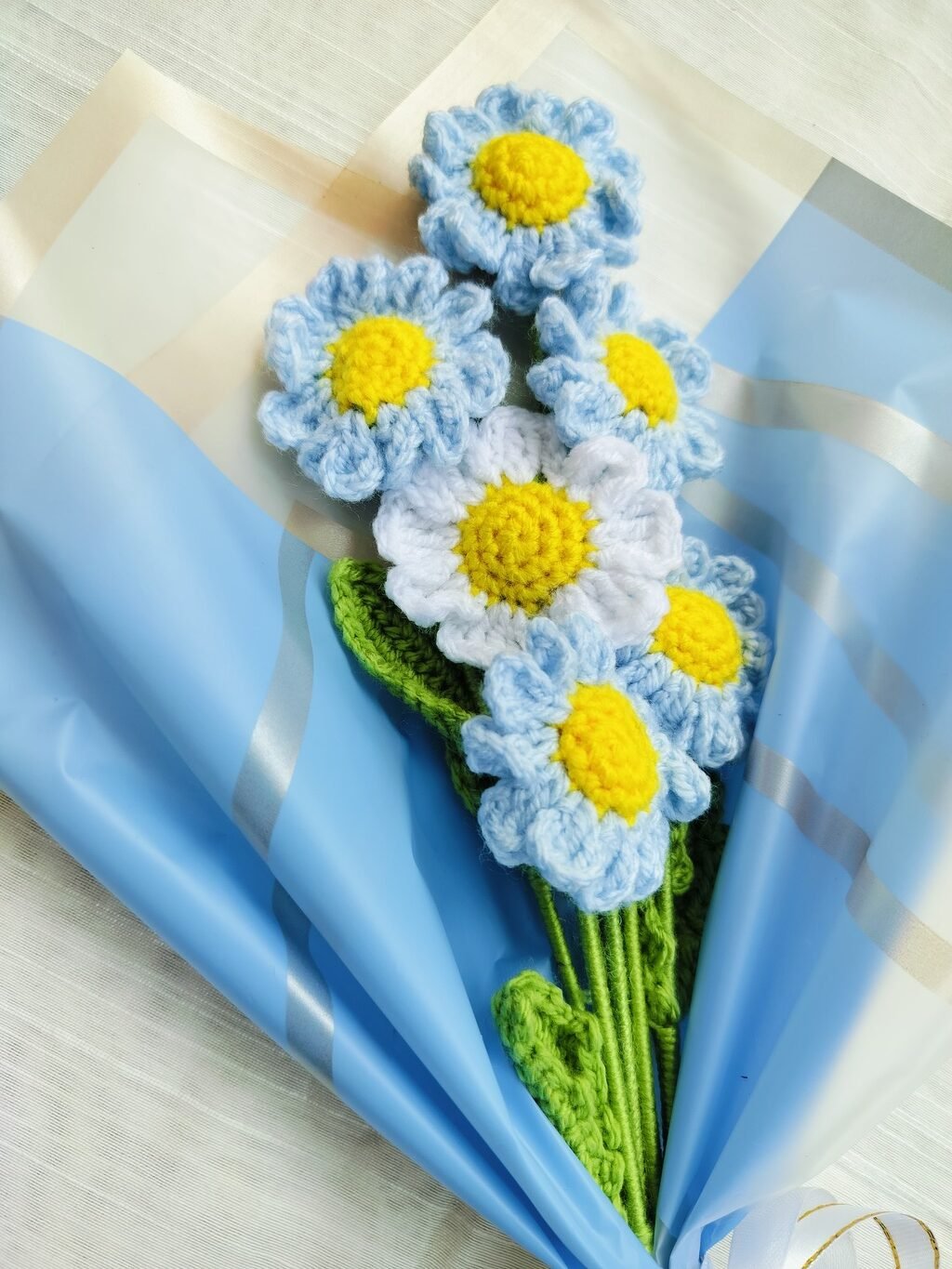 This charming crochet bouquet features six cheerful daisy flowers, each carefully handmade with soft yarn. A timeless, vibrant addition to any space, it’s perfect for brightening up a room or as a thoughtful gift.